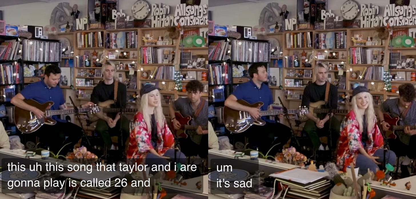 When Paramore appeared on NPR Music’s Tiny Desk Concert, they performed three songs in the following order: “Hard Times,” “26,” and “Fake Happy”. After performing “Hard Times,” Hayley Williams says to the crowd, “Um, by the way, sing, if you want, and dance?” before launching into one of the saddest songs of the album.